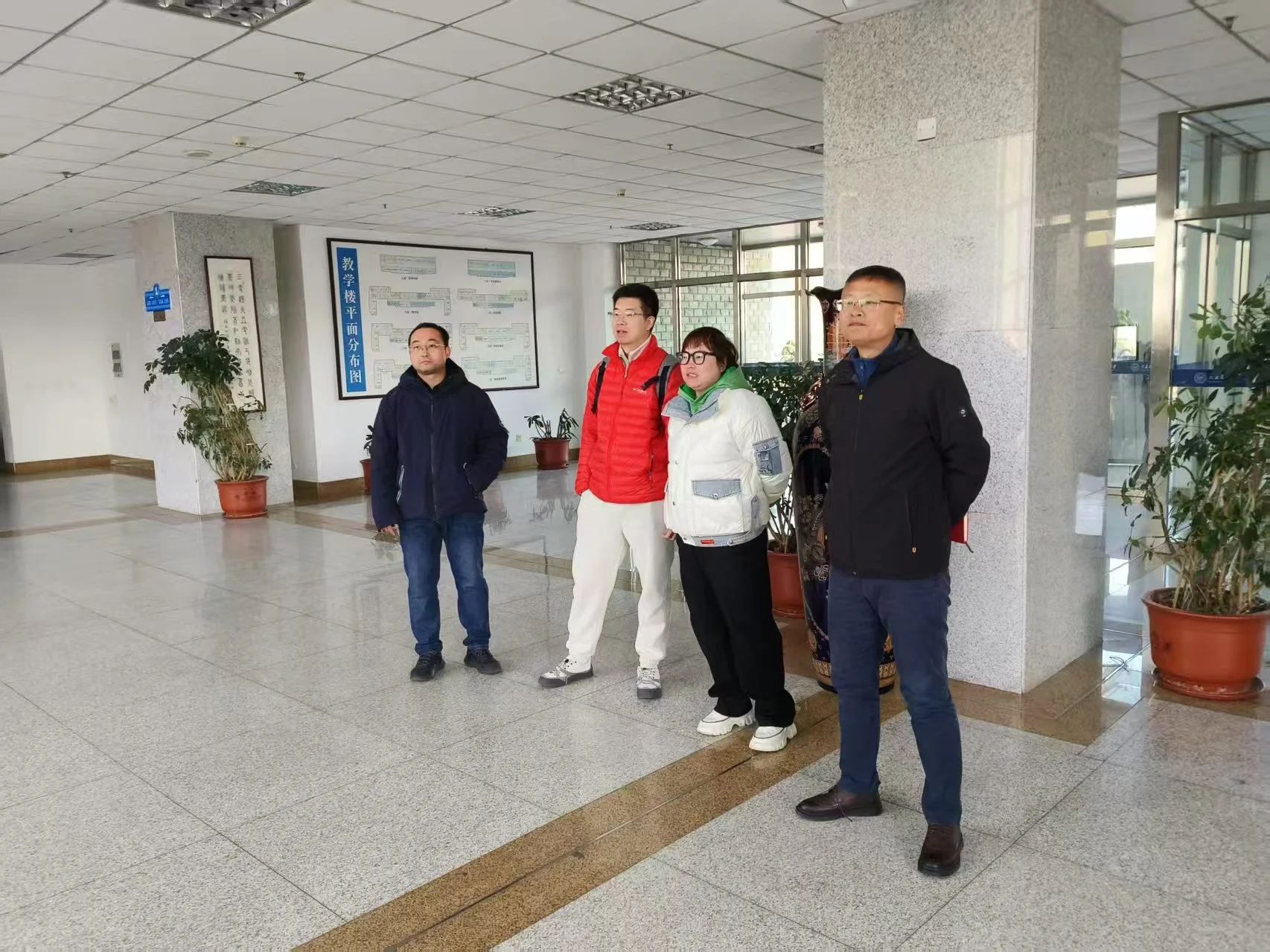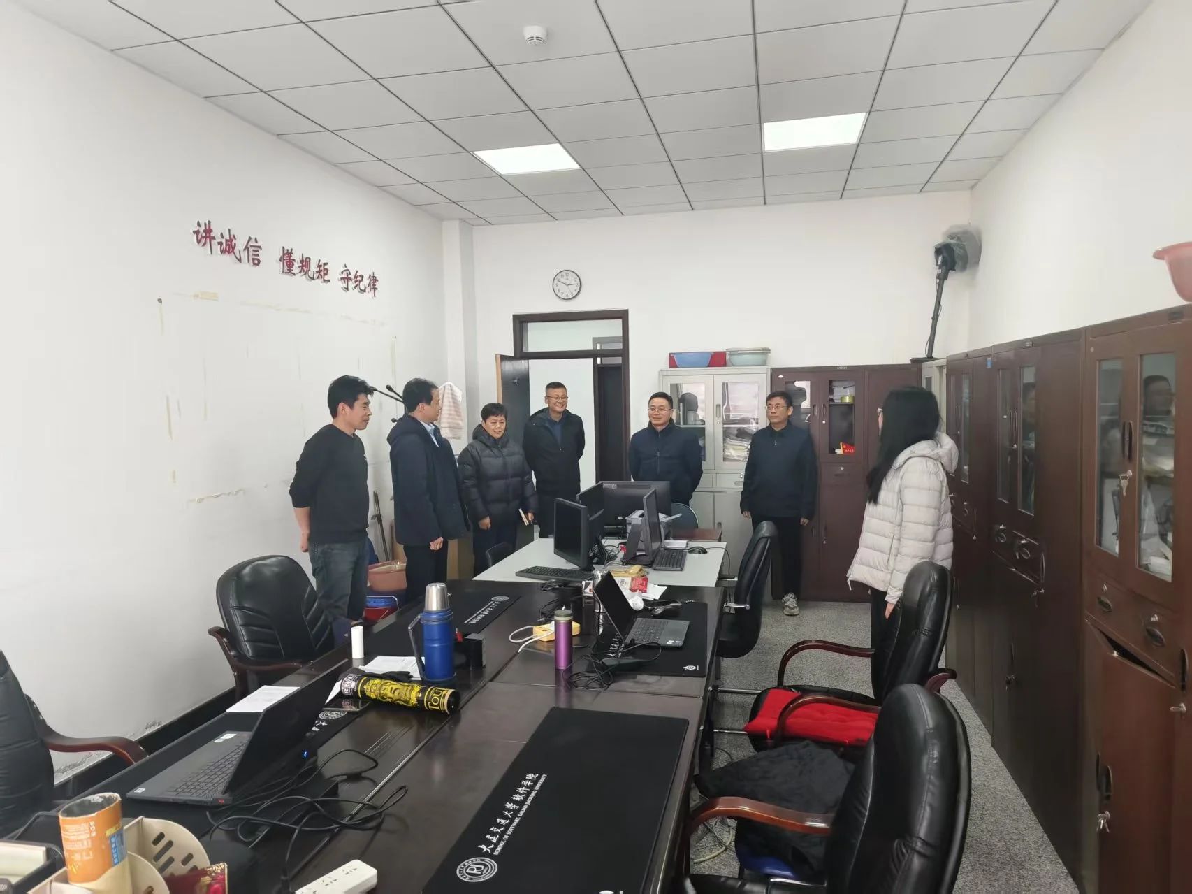 办公楼内,学院领导来到教师办公室,与教师们交流,关心大家的工作与生活,为新学期的发展注入温暖与力量。