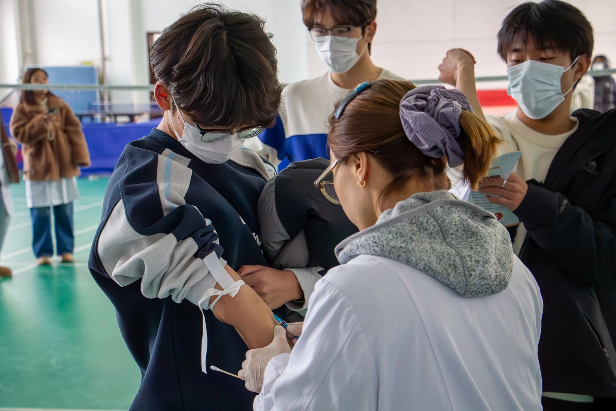 活动当天,室外寒风凛冽,会议中心多功能厅内秩序井然。医护人员与志愿者提前完成场地布置,明确分工负责各环节工作,保障献血流程高效推进。学院学子踊跃参与,既有首次献血的同学,在紧张中坚守奉献初心;也有多次参与的 “老面孔”,熟练配合完成各项流程,并主动鼓励身边同学。