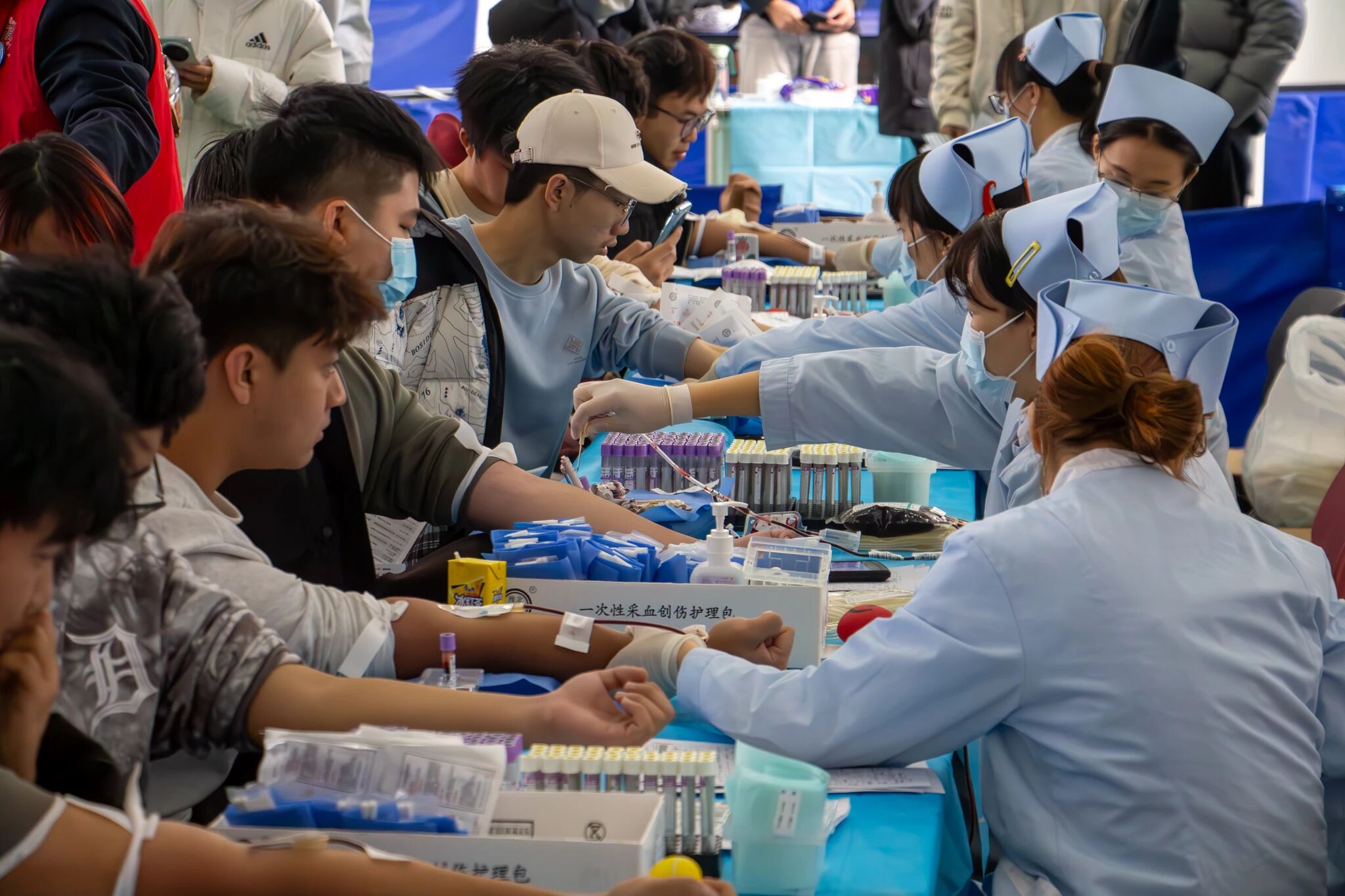 化验结果合格后,献血者前往献血区进行采血,全程由专业医护人员操作,保障采血过程安全顺畅。当鲜红的血液流入血袋,这份青春的善意,成为冬日里最耀眼的光。